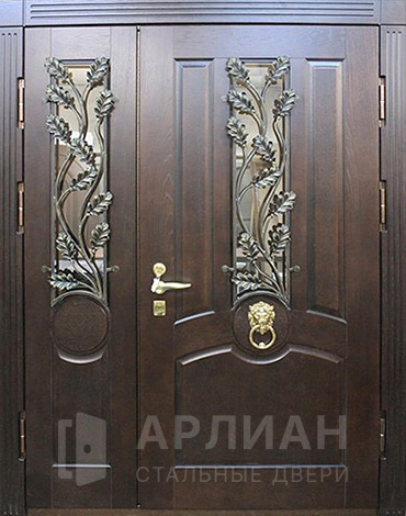Полуторная входная дверь с элементами ковки и стеклом №72